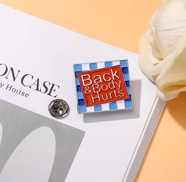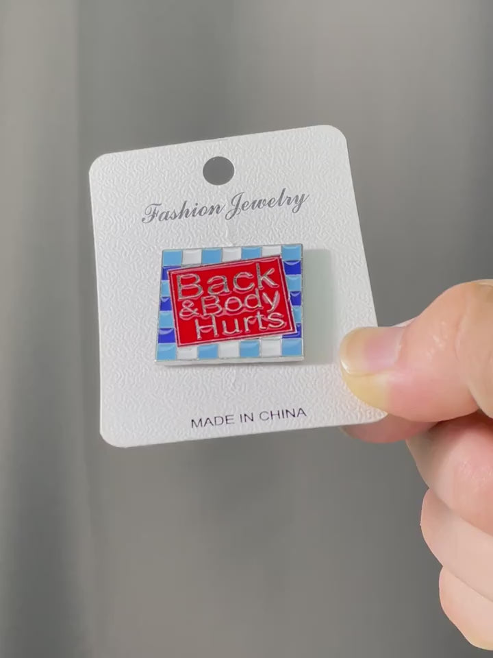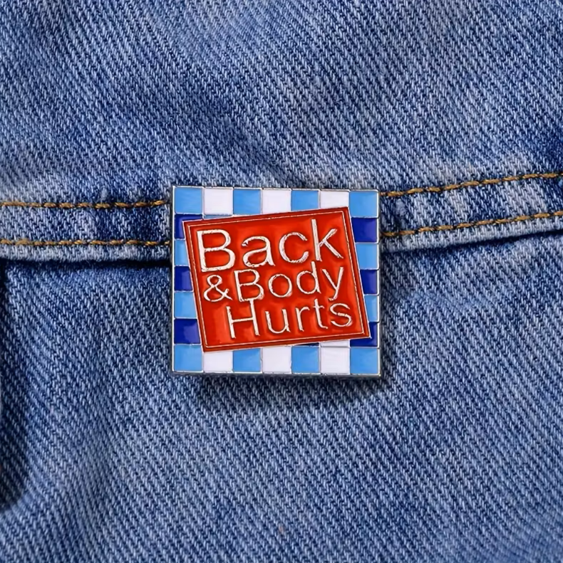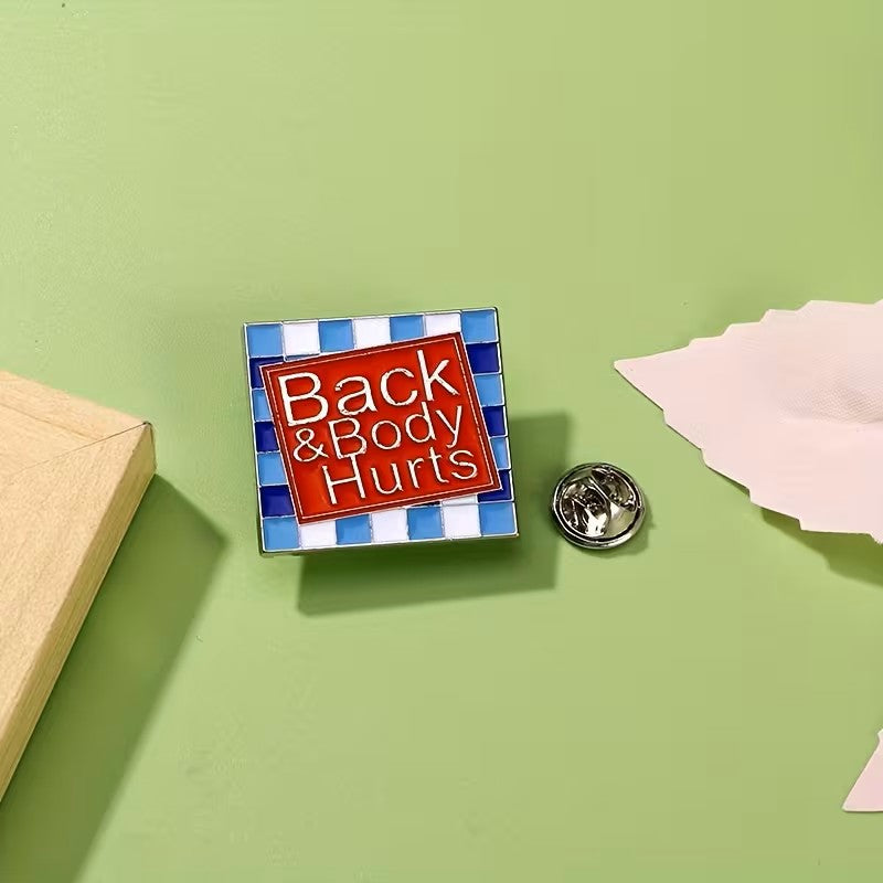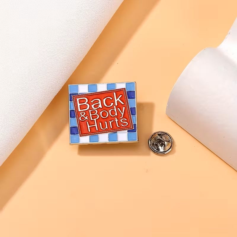 Enamel Pin Badge "Back & Body Hurts" with Blue Checkered Frame, Fashionable Unisex Brooch, Lapel Pin, Scarf Clasp, Perfect for Clothing, Bags, Shoes, Ideal for Birthday, Anniversary, Graduation Gifts, All-Season Wear